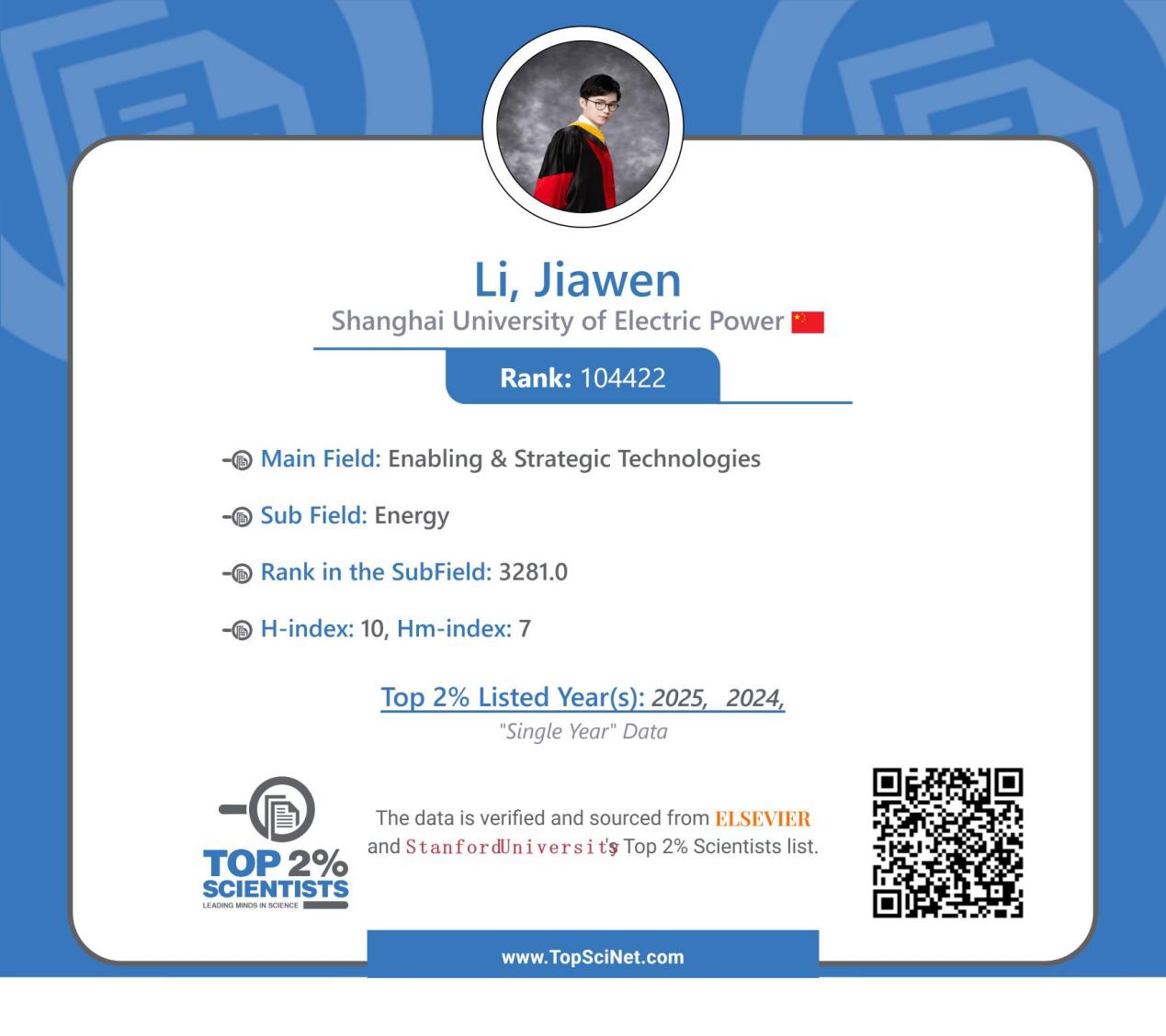 2025年9月19日,美国斯坦福大学与爱思唯尔(Elsevier)数据库共同发布了《全球前2%顶尖科学家榜单2025》。必赢官网李嘉文副教授入选本年度“年度科学影响力排行榜”,位列全球前2%顶尖科学家之列。这是李嘉文副教授继去年入选后,第二次获此殊荣。